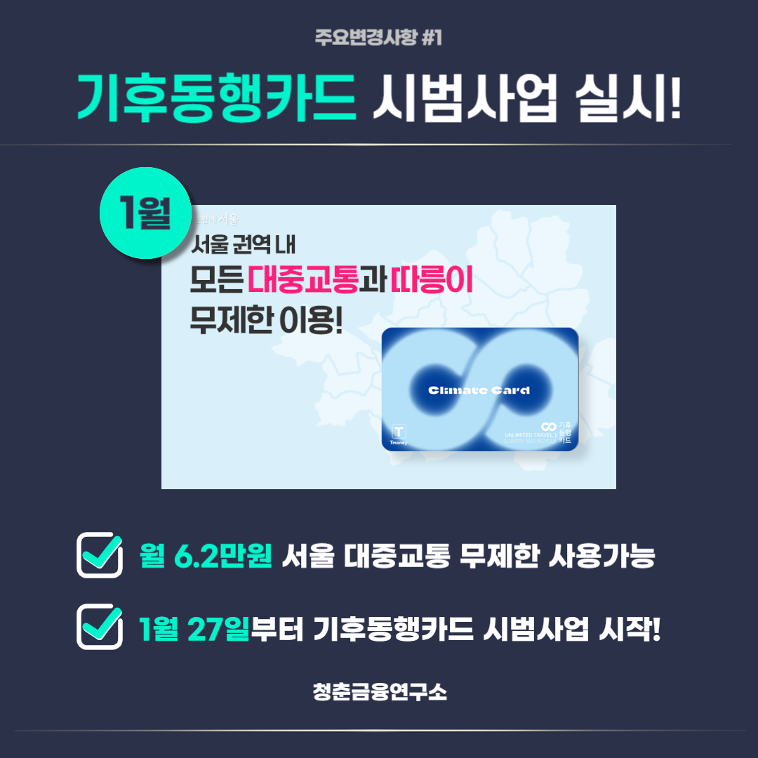 1월 27일 월 6만 5천원(따릉이 미이용 시 6.2만원)으로 서울에 있는 지하철, 버스 등 대중교통을 무제한으로 이용할 수 있는 서울시 기후동행카드의 시범사업이 시작되는데요.