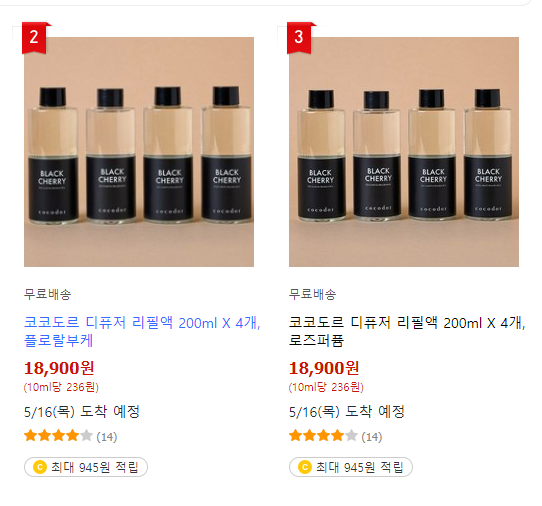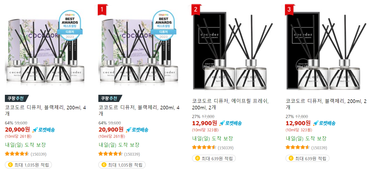 현재 쿠팡에서 파는 코코도르 디퓨저의 경우 200ml 2개의 12,900원에 판매가 되고 있네요. 해당 제품에는 리필액이 포함되지 않은 가격이니 리필액 가격도 한번 살펴보도록 하겠습니다.
