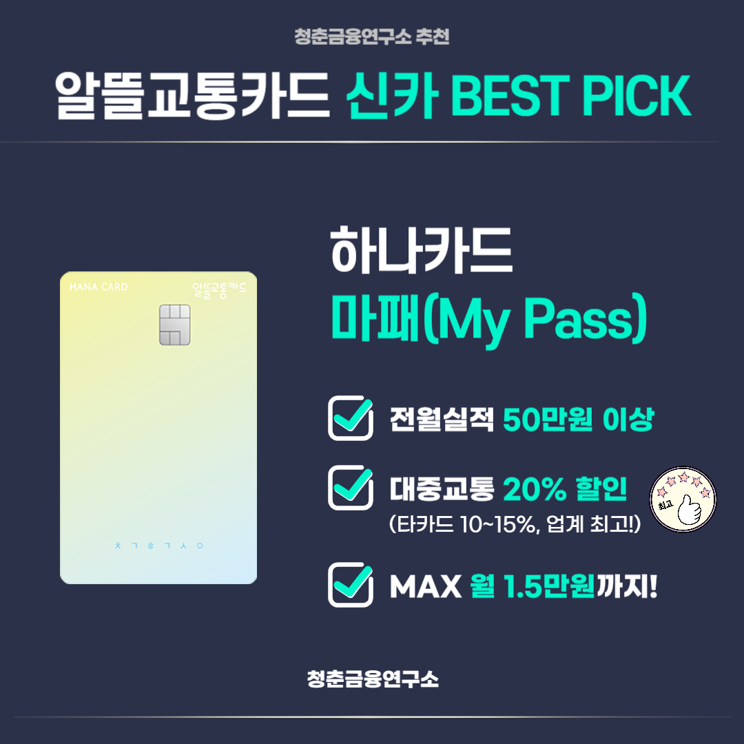 이 중 가장 높은 교통비 할인혜택을 제공하는 카드사는 체크카드와 동일하게 하나카드사 인데요. 알뜰교통 my pass 마패 신용카드(Hana-BC)는 무려 20%의 할인율과 월 최대 1.5만원까지 할인혜택을 제공하고 있습니다.(+ 편의점 10%, 스벅 10%)